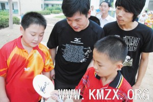 孩子们纷纷 找偶像签名昨天下午,在援建的曲阜市南辛镇尼山令辉星际希望学校和小雪镇孟子故里令辉星际希望小学,世界乒乓球冠军孔令辉成为孩子们眼中的大明星,看到孔令辉能够教他们打乒乓球,让这群农村的孩子感受到明星的魅力,不少小学生争先恐后的将孔令辉包围住,希望能够在自己的乒乓球拍上得到孔令辉的鼓励和签名。