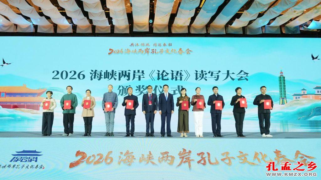 现场举行了“2026海峡两岸《论语》读写大会”颁奖仪式,李世华、孔垂长为荣获“海峡两岸《论语》传习人”称号的优秀代表颁奖。2026海峡两岸《论语》读写大会由山东省人民政府台湾事务办公室、尼山世界儒学中心、中国孔子基金会联合主办,自1月26日启动以来,得到了海峡两岸各界人士的热烈响应和积极参与,共收到诵读类、书写类作品三万余件。大会遴选其中50余幅优秀书法作品在春会现场展出。