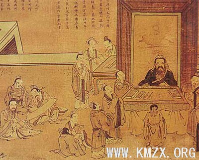 明代《圣迹图》,描绘孔子晚年埋头编著《诗》、《书》、《春秋》;教授学生,培养人才