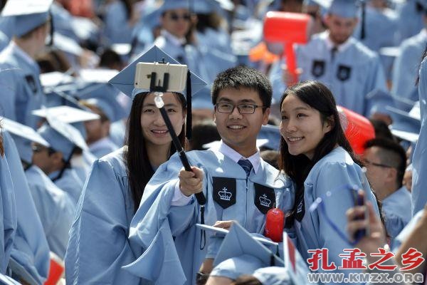 中国留学生在美国哥伦比亚大学毕业典礼上自拍。 新华社记者 王雷 摄