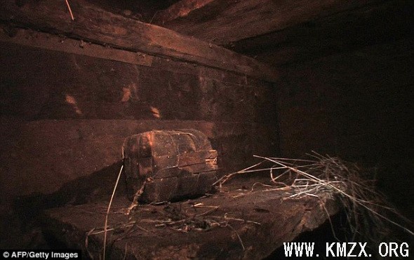 一名探险队员在被发现的木板舱室内。