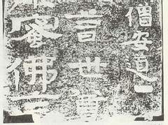 徂徕山摩崖刻石,隶楷书,武平元年(五七○)刻。位于泰安市与新泰市之间的徂徕山东侧。现存二处:一处在光华寺旧址,有一独立巨石,略为棱形,又似河蚌之半,面西石面略平,石高一八五厘米,南北宽二三九厘米,东西石厚九十厘米。西面刻大般若经十三行,行四至七字不等,第九行起刻有“冠军将军梁父县令王子椿造□息道升道昂道昱道柯僧真共造”。第六行下又刻“王世贵”三字,共计八二字。虽有残损,但仍可认读(见图一)。东面刻有佛名和题记,已模糊不清。但“中正胡宾”和“武平元年”尚可辨识。“胡宾”可能是经主,“王世贵”可能是刊石者。从书法风度上看似安道一所书。