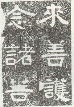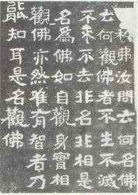 书体与写经体,是摩崖书艺术中的综合创新。我们常看到的真、草、隶、篆、行等书体,在摩崖书中都可以见到。由于自然石壁不透水、不吃墨、加上石质粗糙,写小字很困难,刻起来更不容易奏效。因此,摩崖书多为大字榜书,这样书刻都容易些,写经,由于承袭因素的影响,形成了一种“写经体”,这种书体的特点,一是书写便当、自然、速度较快。写经体一般都是顺势入笔顺势出锋,没有那么多藏锋、回锋、钩折的讲究。如泰山金刚经中,除一个“来”字有钩外(见图四),其它都是顺势提笔而出,不作钩。二是不受书体所限制,真草隶篆自由发挥,所以要完全界定摩崖书的书体很难,一般我们叫它为隶楷书。史料上有称其为正书、真书、隶书、楷书、行书不尽一致。因为第一眼一看,可谓之隶书。再从点画品味,又不全是隶法,魏体(正书)味道颇浓,也可谓正书。再细察比较,其中有篆书字,如:“罗”、“能”、“以”等字。其中也有草书,如“亦”、“定”等字,字的结体和点画间又有连带和流动感,从整体上欣赏,又似行书(见图五、六、七)。三是繁体字和简化字互用,如:“无”、“万”等字。也有异体字、别体字、多笔少画和偏傍部首移位等现象。因此,不了解这些特点和规律就很难辨识和读下来,更不用说去品味其思想内涵了。