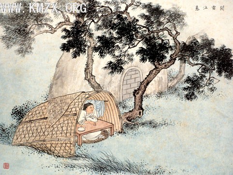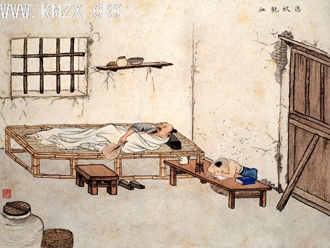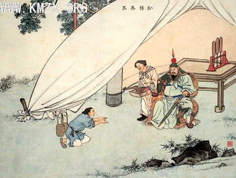 吴猛,晋朝濮阳(河南濮阳)人,八岁时就懂得孝敬父母。家里贫穷,没有蚊帐,蚊虫叮咬使父亲不能安睡。每到夏夜,吴猛总是赤身坐在父亲床前,任蚊虫叮咬而不驱赶,担心蚊虫离开自己去叮咬父亲。