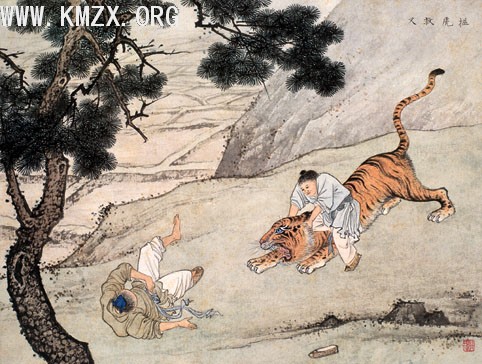 深山逢白虎,努力搏腥风。父子俱无恙,脱离馋口中。